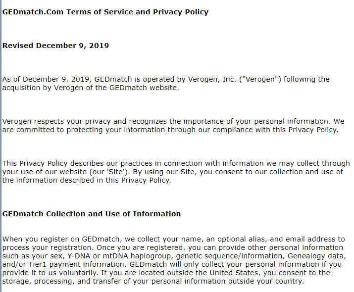We learnt last week that GEDmatch has been acquired by the forensics company Verogen. I now have some further information about the handling of European Union users at GEDmatch. When the sale first went through only a small number of EU users were presented with a consent form in order to access the website. We thought at the time that the form was only being shown to those who had an identifiable e-mail address in the EU. I did not have to re-consent when I first tried to log onto GEDmatch, presumably because my e-mail address had a .com suffix and not a .co.uk suffix. That all changed some time last week, and Verogen are now identifying EU users by their IP address. As a result I found that I had to re-consent to use the site. Below are screenshots of the data transfer form which all EU users are now required to sign.